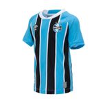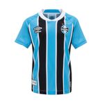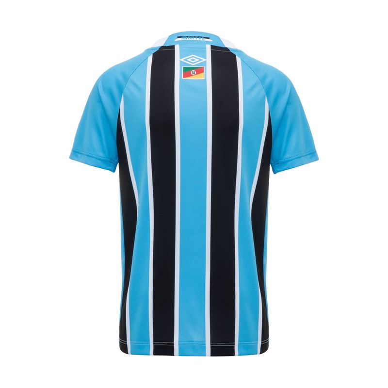 A camisa oficial tricolor infantil para a temporada 2025 mantém as tradicionais listras verticais em azul, preto e branco na frente e nas costas, enquanto as mangas são inteiramente azuis.
