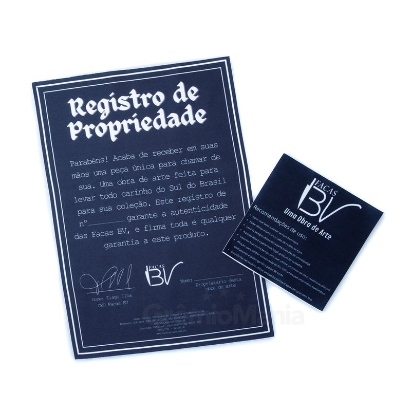 de autenticação gravado na lâmina e na bainha, um registro de propriedade