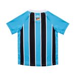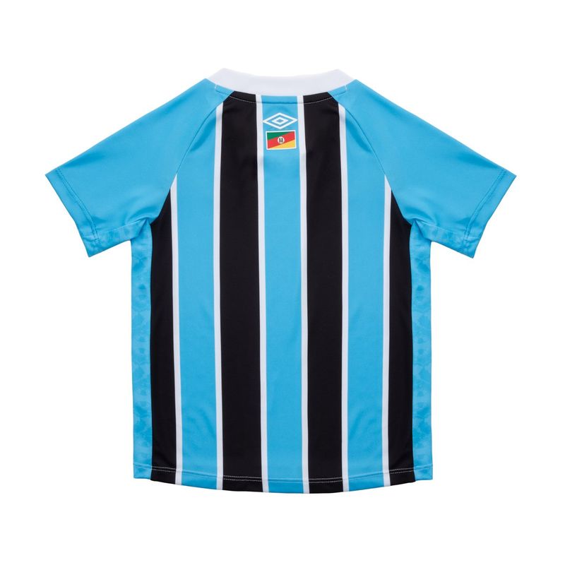 O kit infantil oficial tricolor para a temporada 2025 mantém as tradicionais listras verticais em azul, preto e branco na frente e nas costas, enquanto as mangas são inteiramente azuis. Na frente, a gola é em V e a aplicação do escudo é em silk, assim como o do calção. Feita em tecido 100% poliéster, proporciona conforto para o uso diário. A barra lateral traz grafismos sutis que exibem o escudo de 1985, marcando a primeira aparição das nossas estrelas de bronze, prata e ouro. Nas costas, a etiqueta Imortal aparece acima da bandeira do Rio Grande do Sul, reforçando nossa essência gaúcha. Já na barra inferior, o patch especial com os continentes simboliza a presença da torcida gremista nos quatro cantos do mundo Referência: 1291896